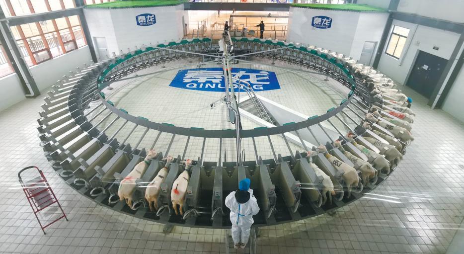 當(dāng)日9時,到了給奶山羊擠奶時間,羊群通過單向趕羊通道有序進(jìn)入百位轉(zhuǎn)盤式智能擠奶設(shè)備完成每日的產(chǎn)奶任務(wù)?!拔覀兪褂玫陌傥晦D(zhuǎn)盤式智能擠奶設(shè)備,實現(xiàn)了每100只羊從清洗到完成擠奶僅需10分鐘,擠奶效率大幅提升?!庇谇邎@說。