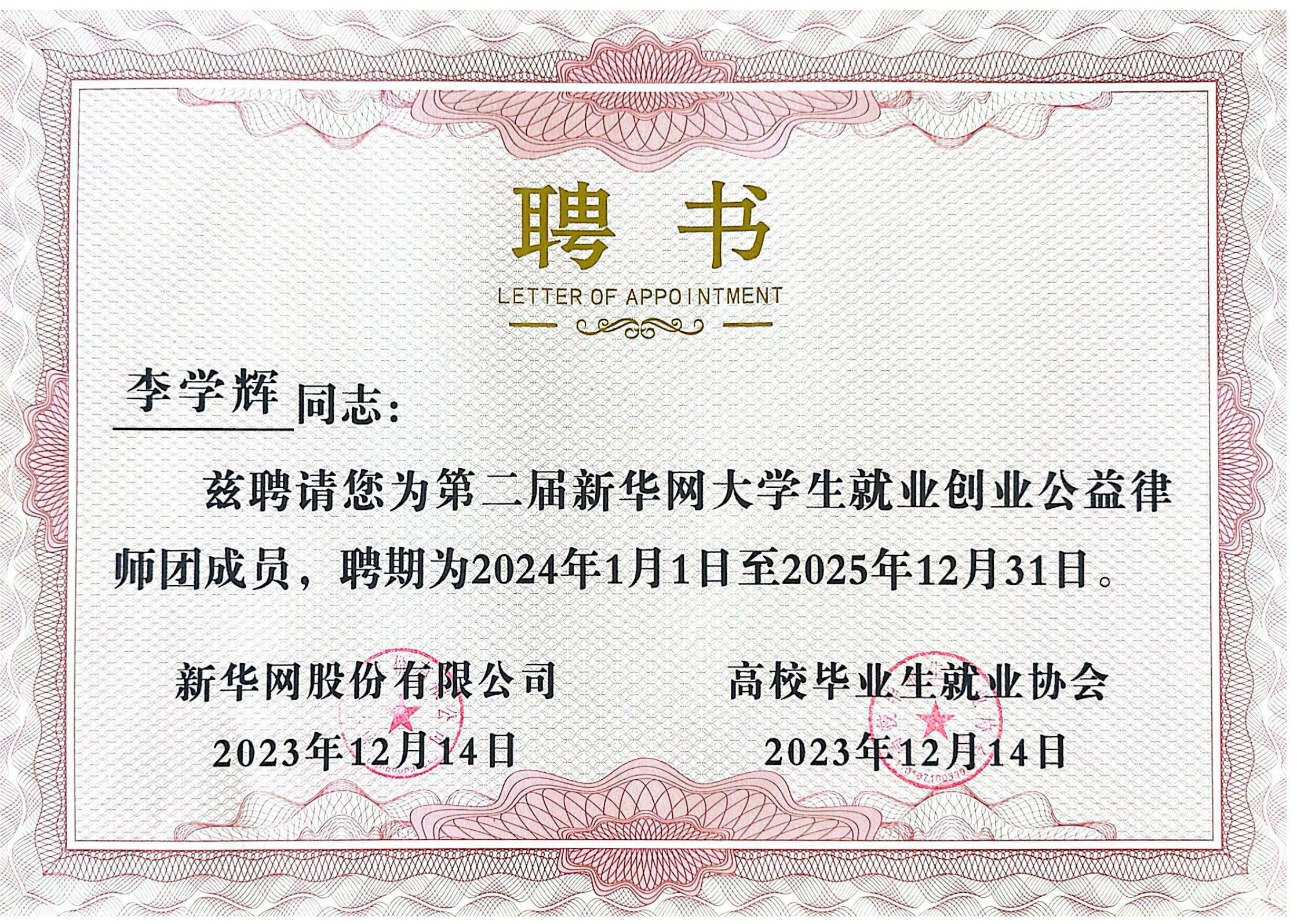 北京市安理律師事務(wù)所黨委副書記、管委會(huì)委員李學(xué)輝律師憑借扎實(shí)的法律功底、過硬的專業(yè)素養(yǎng)、應(yīng)有的責(zé)任擔(dān)當(dāng),受聘擔(dān)任新華網(wǎng)大學(xué)生就業(yè)創(chuàng)業(yè)公益律師團(tuán)成員。