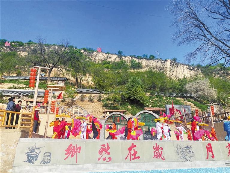 在“兀里紅謠”民宿廣場(chǎng),村民為游客表演秧歌(資料照片) 延安市寶塔區(qū)農(nóng)業(yè)農(nóng)村局供圖