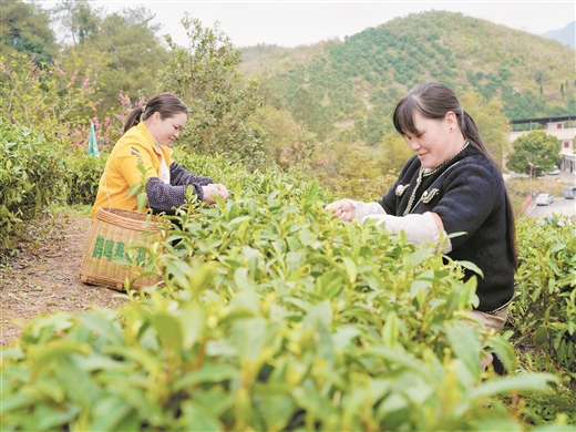 3月6日,在鵲鳴春種茶基地,工人們正在采摘春茶