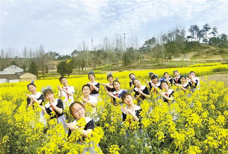 小白鷺合唱團(tuán)的孩子們在學(xué)校附近的油菜花田合影(資料照片)