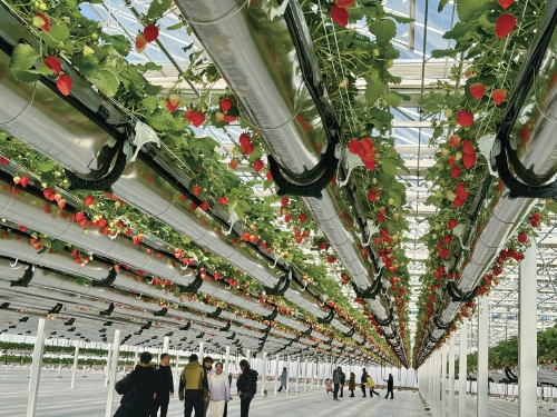 達(dá)拉特旗現(xiàn)代數(shù)字農(nóng)業(yè)科技產(chǎn)業(yè)園空中草莓園項(xiàng)目現(xiàn)場(chǎng),游客們正在參觀 楊耀中 攝