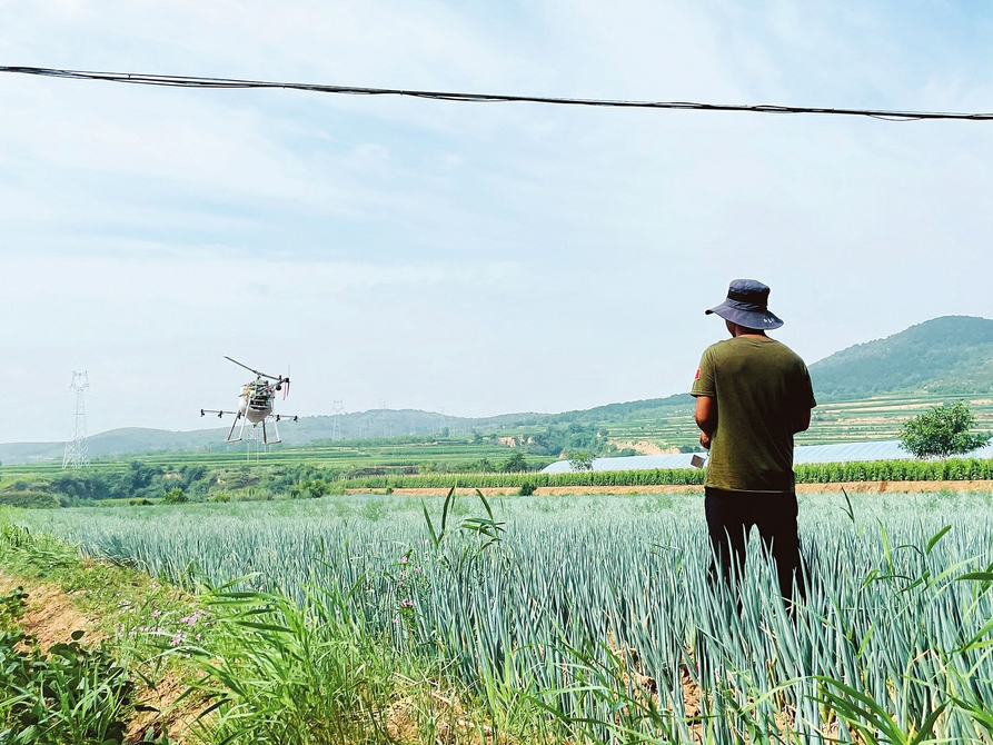 潞城大蔥種植基地,專業(yè)人員操作無人機(jī)進(jìn)行殺蟲藥噴灑工作