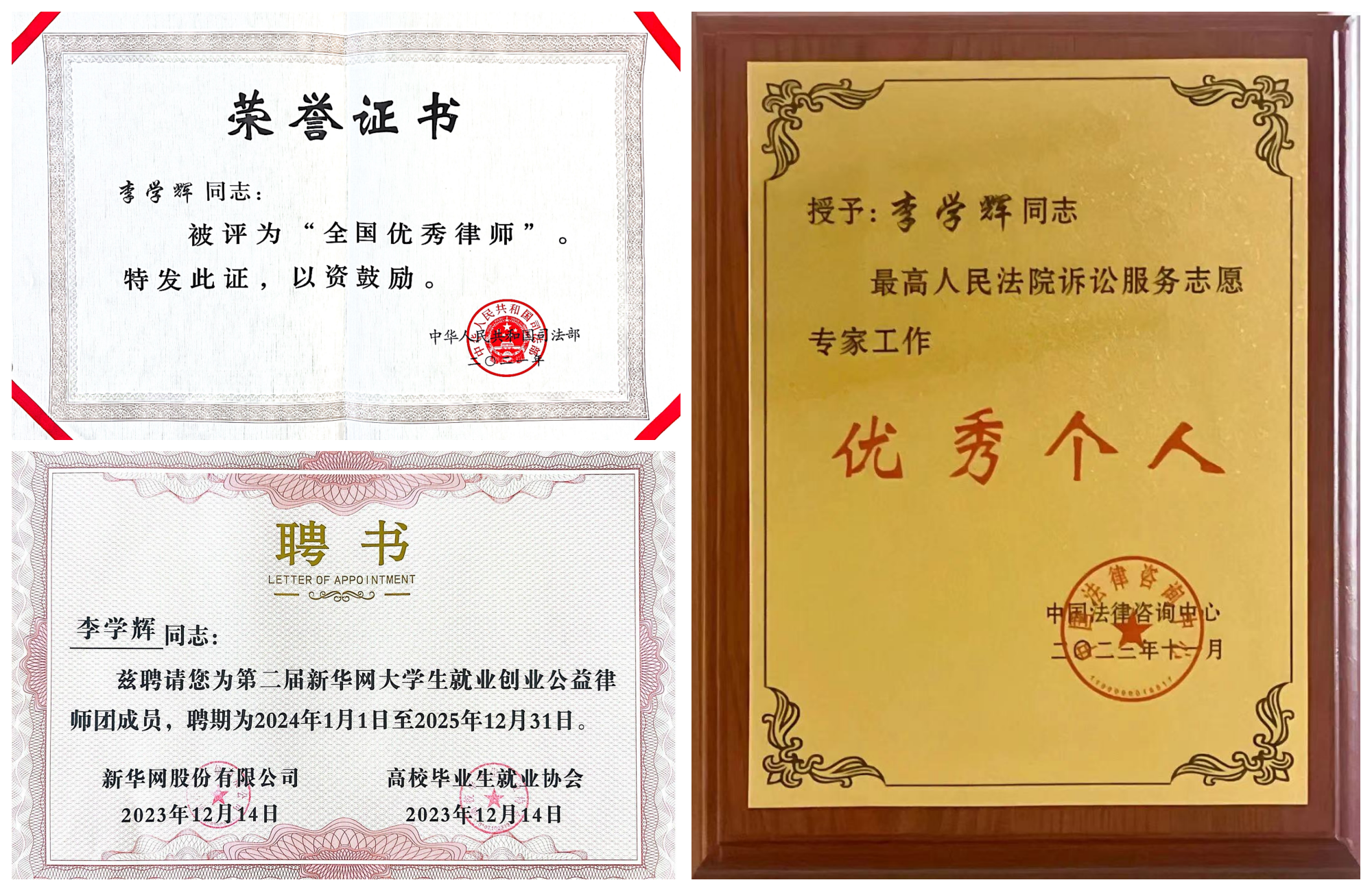 李學輝律師部分榮譽及聘書