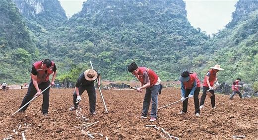 大新縣五山鄉(xiāng)黨員干部到聯(lián)山村撂荒地整治地塊和群眾一起種植甘蔗 王翠寧 攝