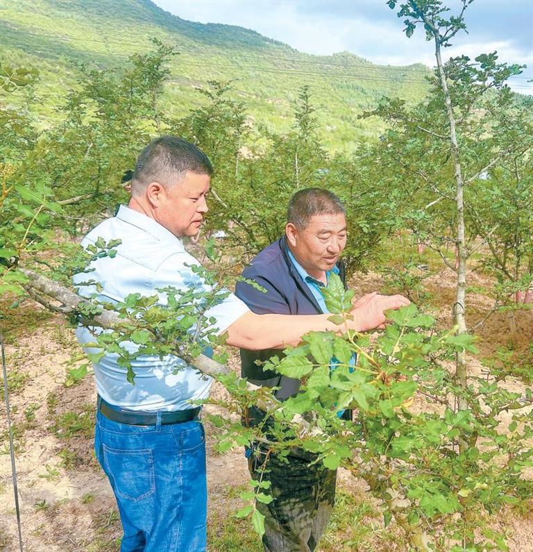 羅小利(右)向林果專家學(xué)習(xí)花椒管理技術(shù) 記者 張子恒 攝