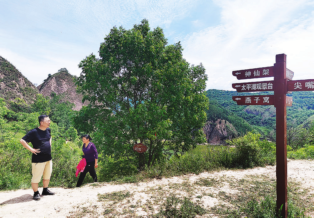 “村里真熱鬧,咋這么多人?”“咱村村民不多,就300多人,其余都是城里來的人,來這兒看燕子窩、太平湖、尖嘴山、夫妻崖的?!?/p>