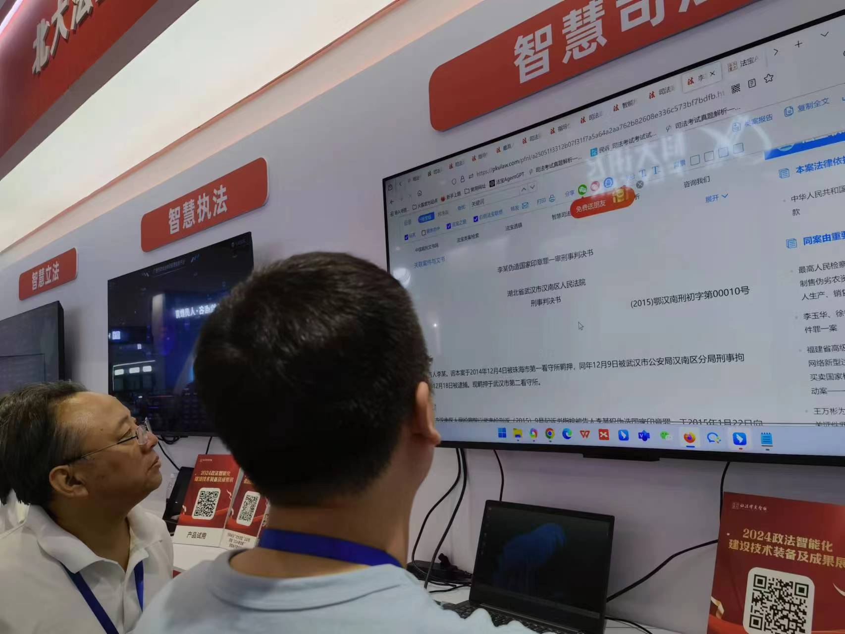 7月10日,記者在北京國(guó)家會(huì)議中心參觀由法制日?qǐng)?bào)社主辦的“2024政法智能化建設(shè)技術(shù)裝備及成果展”(以下簡(jiǎn)稱“政法裝備展”)時(shí),看到了法律大模型給司法工作帶來高效便捷新賦能的各類演示場(chǎng)景。