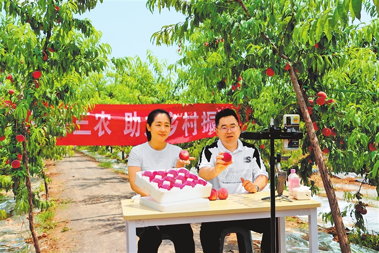 新鄉(xiāng)郵政直播團(tuán)隊(duì)深入衛(wèi)輝萬(wàn)畝桃園田間地頭直播賣(mài)桃 記者 任娜 攝