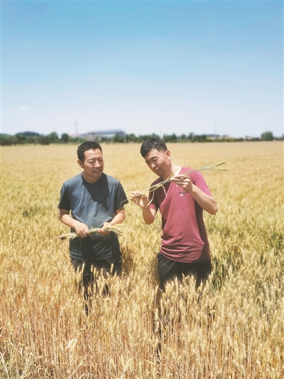 農民正高級農藝師張付寶(右)在觀察莊稼長勢