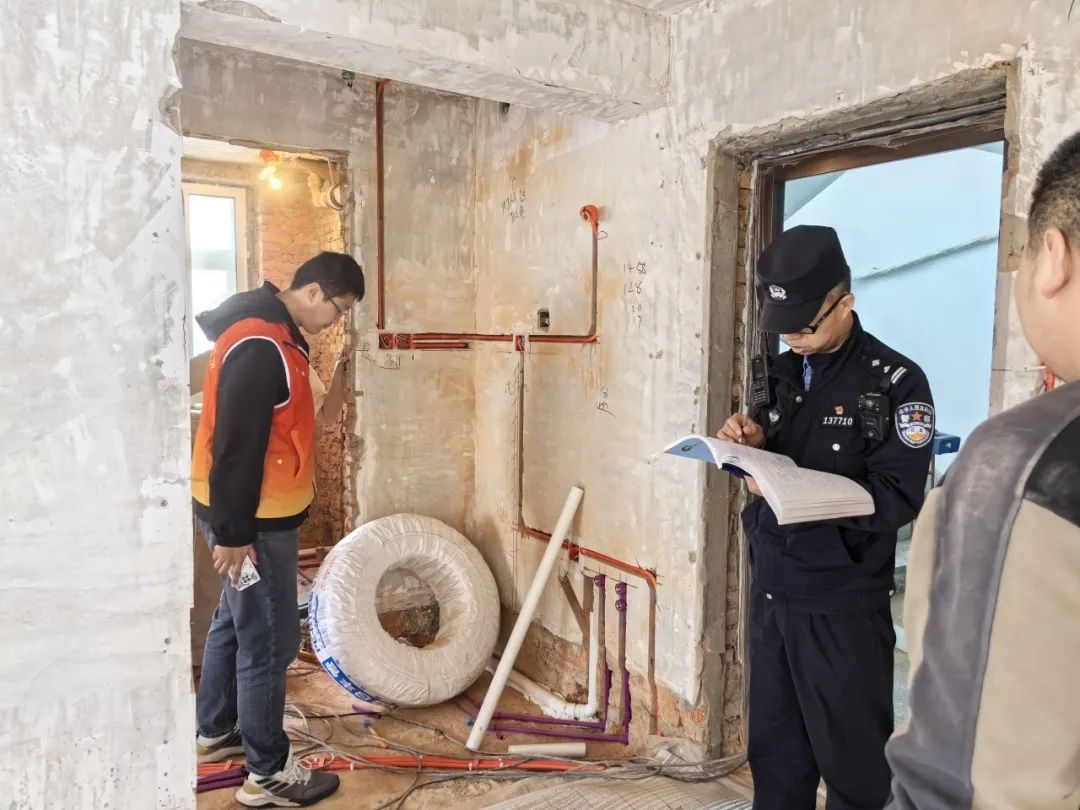 在去往陳先生家的路上,筆者小步快跑才跟得上丁超剛的腳步,筆者問:“你每天走這么多路,會很累嗎?”丁超剛說:“每天這樣都習(xí)慣了,我以前每天跑五公里,自從當(dāng)了社區(qū)民警,每天工作都能走兩萬步,鍛煉與工作相結(jié)合,也挺好!”到達(dá)裝修現(xiàn)場,丁超剛和網(wǎng)格員向裝修工人普及了噪音施工相關(guān)規(guī)定,叮囑他們在規(guī)定時段內(nèi)施工,自覺遵守相關(guān)法律法規(guī)要求。
