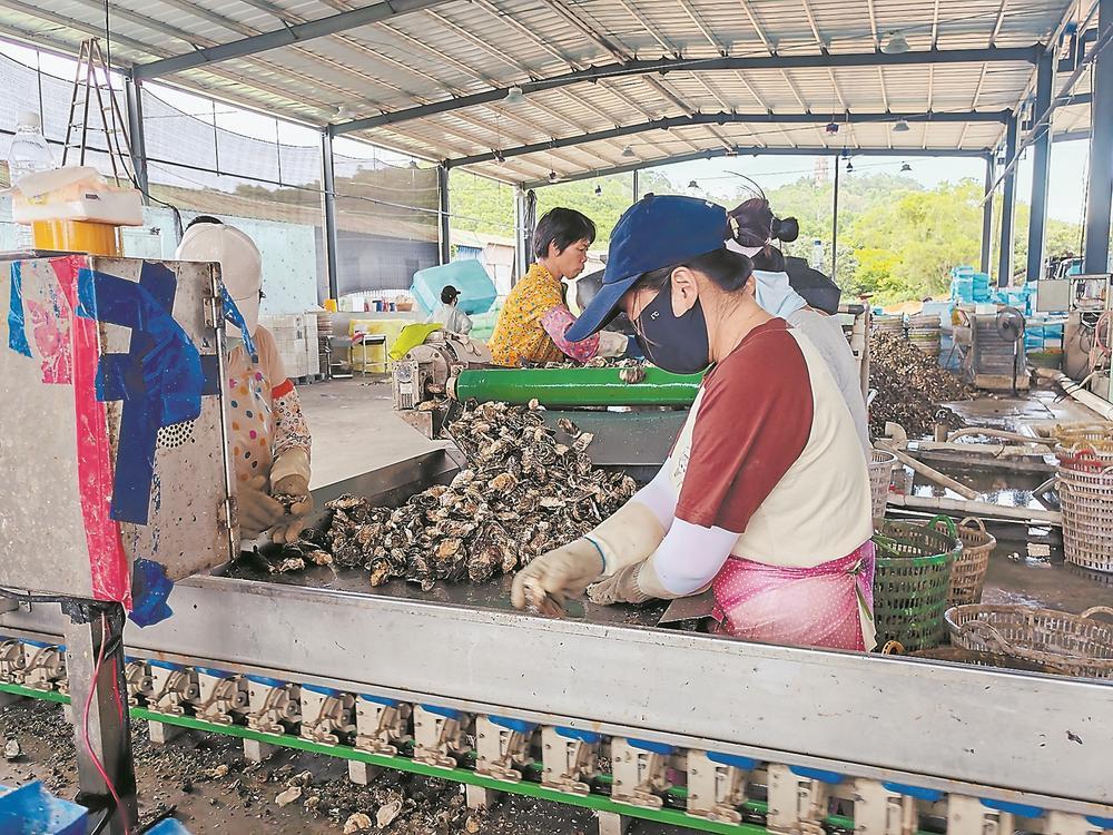 位于梅嶺鎮(zhèn)臘洲村的牡蠣集中開殼場,一派熱火朝天的忙碌景象。流水線不停運轉,自動將生蠔分大中小不同等級,幾百名工人熟練地挑揀、沖洗、包裝,每天約400噸的牡蠣從這里銷往大陸各省區(qū)市的商場和超市。