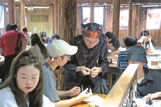當(dāng)下,“非遺+旅游”成了苗寨文旅融合發(fā)展的新熱點(diǎn)。當(dāng)?shù)匾劳蟹沁z資源優(yōu)勢(shì),圍繞蠟染、刺繡、銀飾等非遺文化,推出非遺研學(xué)體驗(yàn)文旅項(xiàng)目,吸引了大批游客前來(lái)。