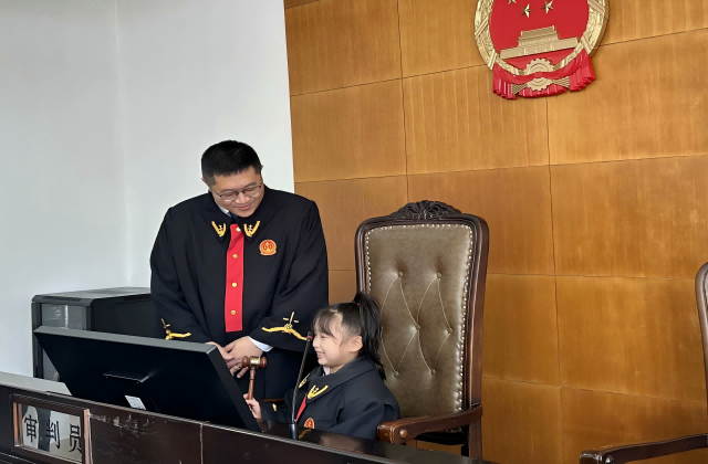 小朋友們?cè)诠ぷ魅藛T的帶領(lǐng)下步入審判庭,他們穿上法袍,坐上審判席,敲響法槌,深度體驗(yàn)“小法官”的角色。在工作人員的演示與指導(dǎo)下,孩子們進(jìn)一步知曉了法庭工作人員的職責(zé)。