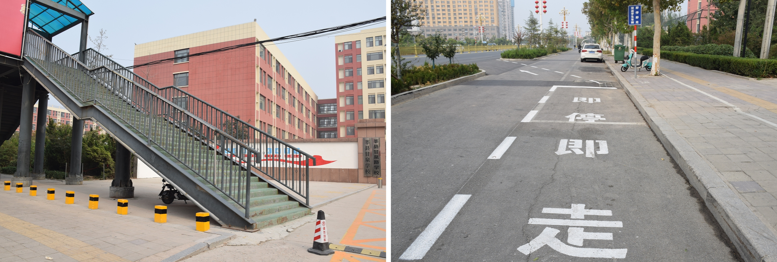 在甘泉學(xué)校,入學(xué)口還設(shè)有硬隔離樁防止汽車(chē)、電動(dòng)自行車(chē)進(jìn)入,人行過(guò)街天橋用作學(xué)生上下學(xué)專(zhuān)用通道……