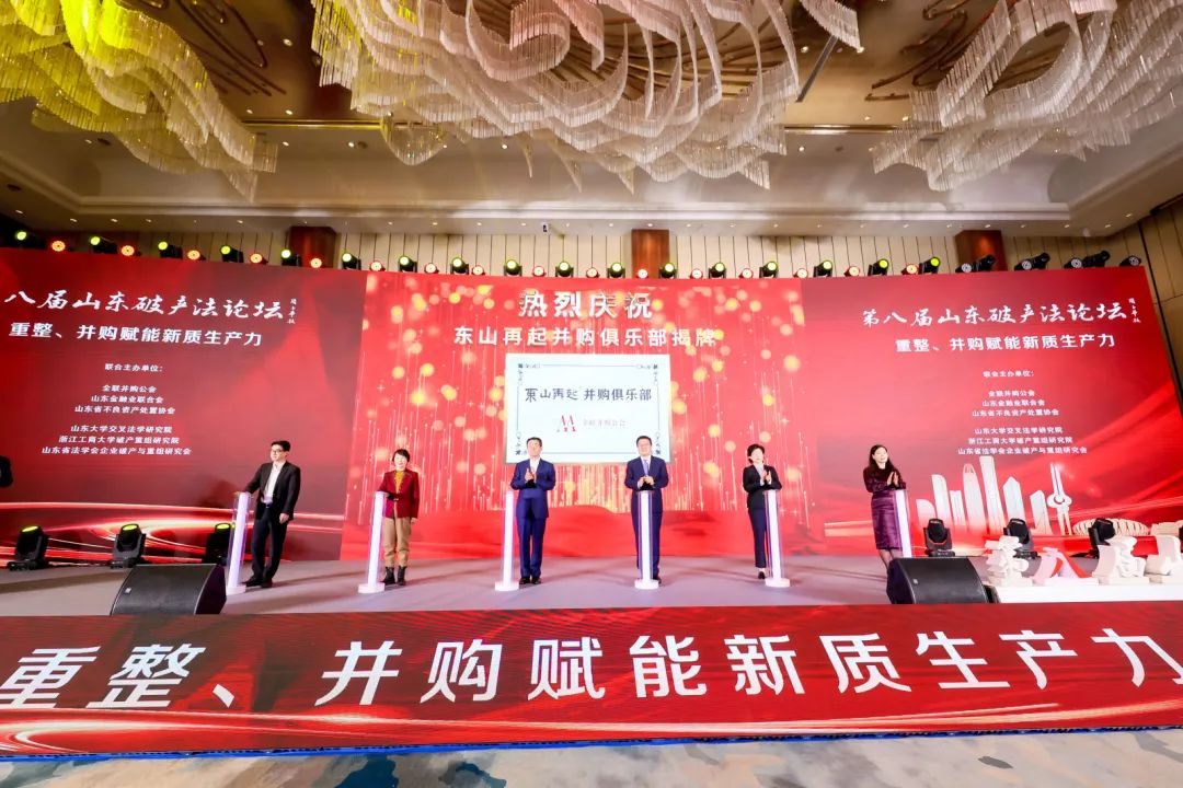 全國工商聯(lián)第十三屆常委、全聯(lián)并購公會尉立東會長,山東金融業(yè)聯(lián)合會何修崟秘書長,山東省不良資產(chǎn)處置協(xié)會李薇華會長,山東省法學會企業(yè)破產(chǎn)與重組研究會劉平會長,山東省法學會企業(yè)破產(chǎn)與重組研究會副會長、山東大學交叉法學研究院常務副院長張海燕教授,浙江工商大學破產(chǎn)重組研究院執(zhí)行院長蘇潔澈教授一起按下揭牌鍵。