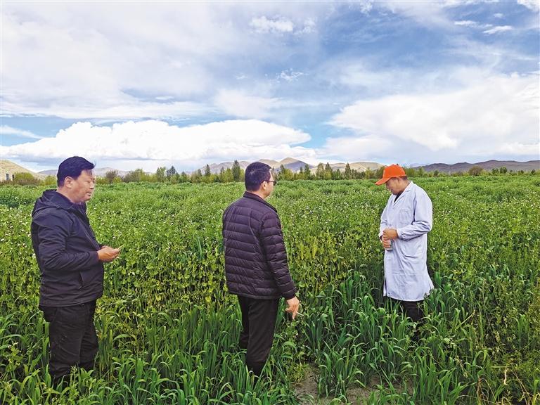 浪卡子縣農(nóng)業(yè)農(nóng)村局技術(shù)人員在朗杰塘飼草基地開展技術(shù)指導 記者 巴桑旺姆 攝