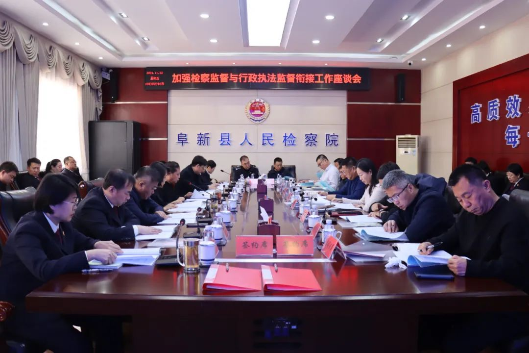 為全面落實(shí)《中共中央關(guān)于加強(qiáng)新時代檢察機(jī)關(guān)法律監(jiān)督工作的實(shí)施意見》和最高檢《關(guān)于推進(jìn)行刑雙向銜接和行政違法行為監(jiān)督構(gòu)建檢察監(jiān)督與行政執(zhí)法銜接制度的意見》,有效推動檢察監(jiān)督與行政執(zhí)法監(jiān)督的銜接配合,助推法治政府建設(shè),11月22日,遼寧省阜新縣人民檢察院與阜新縣司法局聯(lián)合召開了加強(qiáng)檢察監(jiān)督與行政執(zhí)法監(jiān)督銜接工作座談會??h委常委、副縣長張文遠(yuǎn),縣委常委、政法委書記王立靖參加會議并講話??h公安局、縣司法局、縣工業(yè)和信息化局、縣人力資源和社會保障局、縣住房和城鄉(xiāng)建設(shè)局、縣水利局、縣應(yīng)急管理局、縣林業(yè)和草原局等12家行政單位參加了座談會。市人民檢察院、縣紀(jì)委監(jiān)委、縣人民法院派員參加了會議。