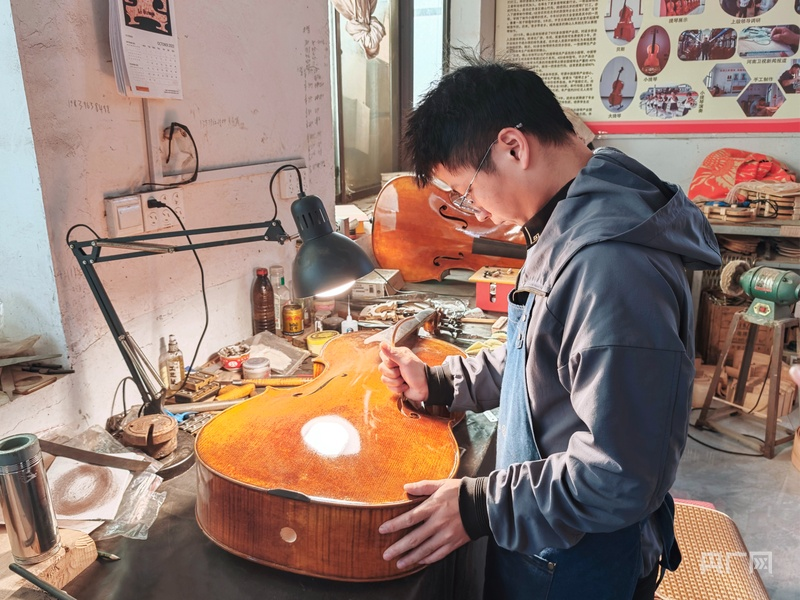 確山縣手工提琴制作協(xié)會(huì)會(huì)長(zhǎng)王金堂見證了家鄉(xiāng)提琴產(chǎn)業(yè)從無(wú)到有、從弱到強(qiáng)的全過程。2015年,他率先返鄉(xiāng)創(chuàng)立河南省金鳴樂器股份有限公司,并帶領(lǐng)一批制琴師回到確山創(chuàng)業(yè)。他們通過改進(jìn)工藝、研發(fā)新品,將確山提琴打造成國(guó)際高端市場(chǎng)的寵兒。王金堂介紹,他的一把定制手工提琴曾以20萬(wàn)美元的價(jià)格賣出。