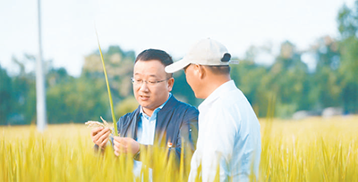 張家墊村黨總支書(shū)記張?jiān)疲ㄗ螅┥钊胩镩g地頭向種糧大戶了解種植情況(資料圖片)