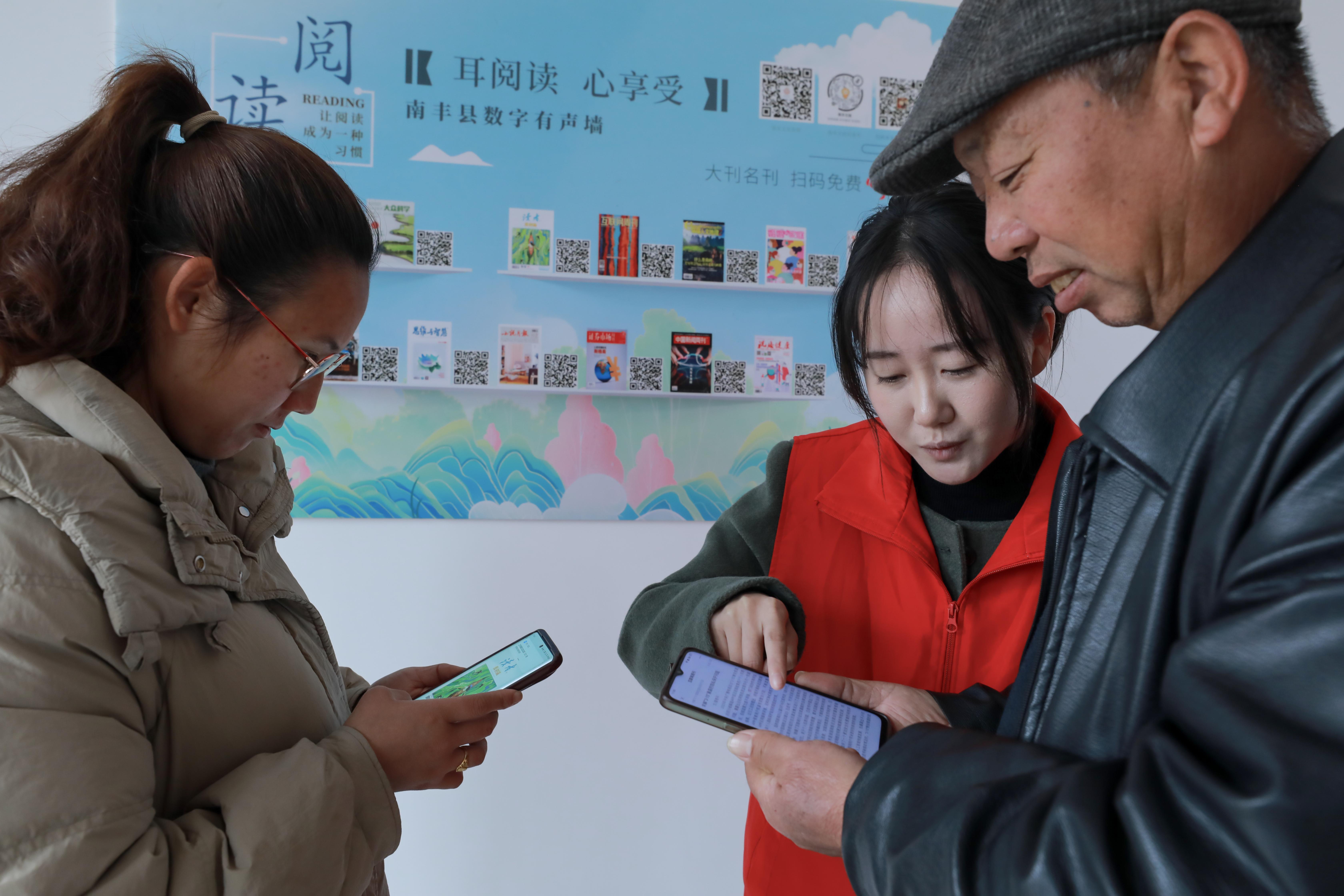 志愿者在農(nóng)家書屋指導(dǎo)村民使用數(shù)字閱讀軟件