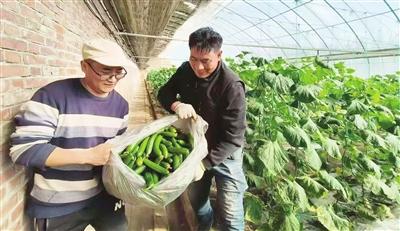 雙街果蔬采摘園內(nèi),工人們在蔬菜大棚里抬著剛剛采摘的水果黃瓜。照片由受訪單位提供