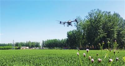 薊州區(qū)侯家營(yíng)鎮(zhèn)王家堡村高標(biāo)準(zhǔn)農(nóng)田,無(wú)人機(jī)在執(zhí)行噴施作業(yè)。