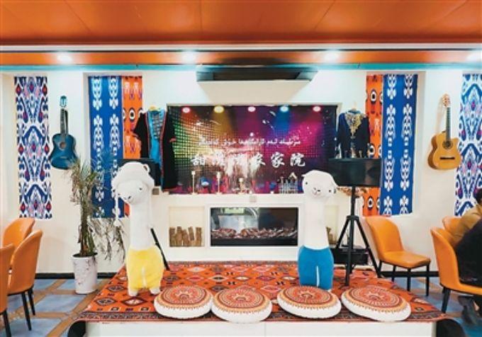 塔村內(nèi),努爾曼古麗·吐?tīng)栠d經(jīng)營(yíng)的“甜滋滋農(nóng)家院”,院內(nèi)裝飾民族風(fēng)情濃郁。記者 丁美棟 攝