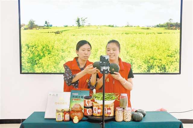 忠縣馬灌鎮(zhèn)電商基地,冉乙婷(右)和同事在直播。(忠縣縣委組織部供圖)