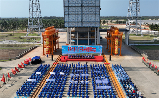 在文昌航天發(fā)射場,每次發(fā)射前都有一項特殊的“出征儀式”——火箭垂直轉運。航天人深情凝望火箭活動發(fā)射平臺上的鮮紅國旗和動員標語,揮舞黨旗、唱響紅歌、誓師動員……這項特殊的儀式,見證著祖國航天事業(yè)的騰飛,也為重大航天發(fā)射任務注入不竭的精神動力。