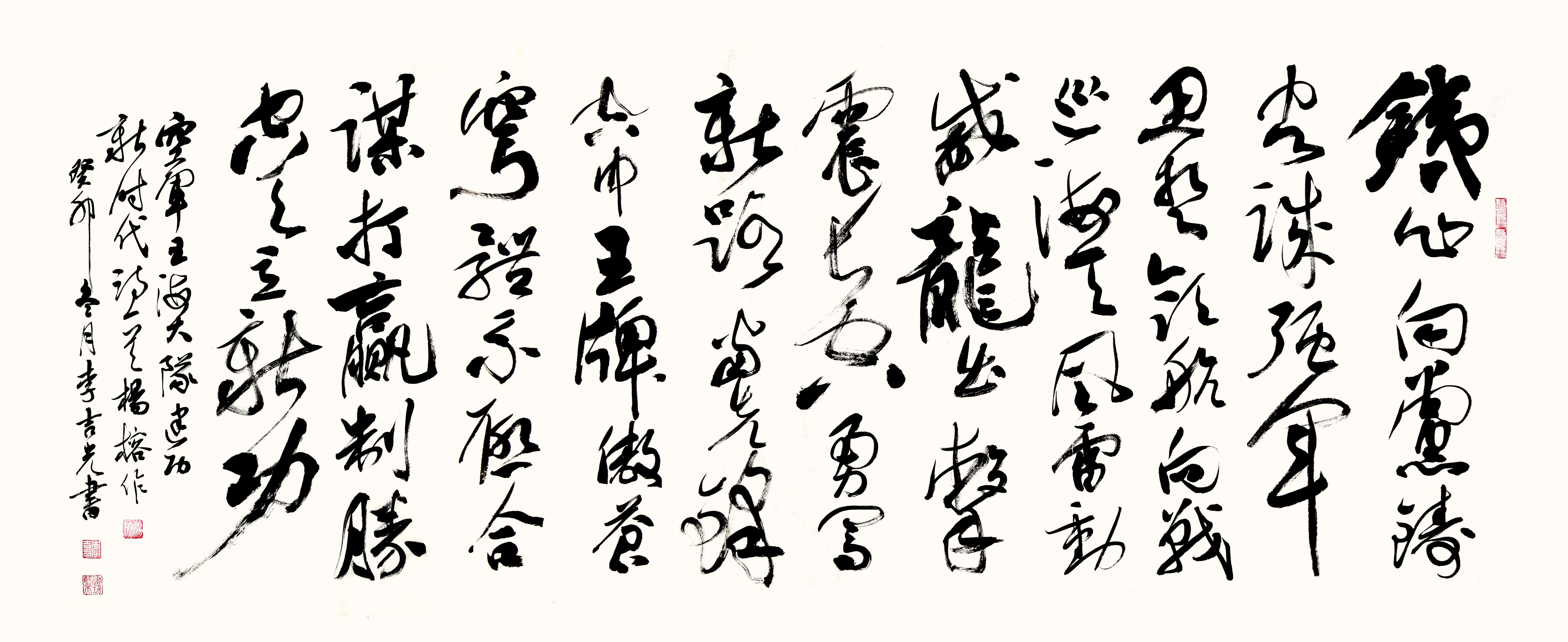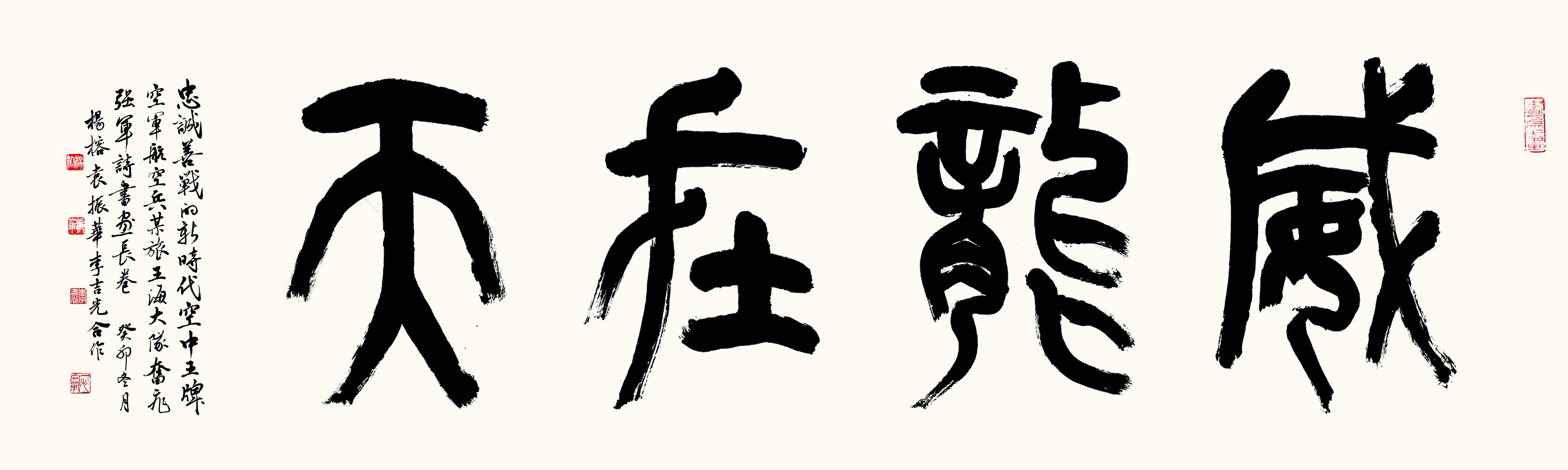 《威龍?jiān)谔臁吩姇嬮L卷,以中國傳統(tǒng)文化中的詩詞、書法和繪畫的藝術(shù)形式,通過傳統(tǒng)筆墨全景式展現(xiàn)70多年來“王海大隊(duì)”的“聞戰(zhàn)則喜,英勇頑強(qiáng),敢打必勝,有我無敵”的精神傳承和價(jià)值追求。英雄傳人亦英雄,新時(shí)代“王海大隊(duì)”昂首闊步,敢闖新路,當(dāng)先鋒打頭陣,奮力譜寫強(qiáng)軍興軍新征程的時(shí)代篇章,奮飛一流、制勝空天的鮮活畫卷。