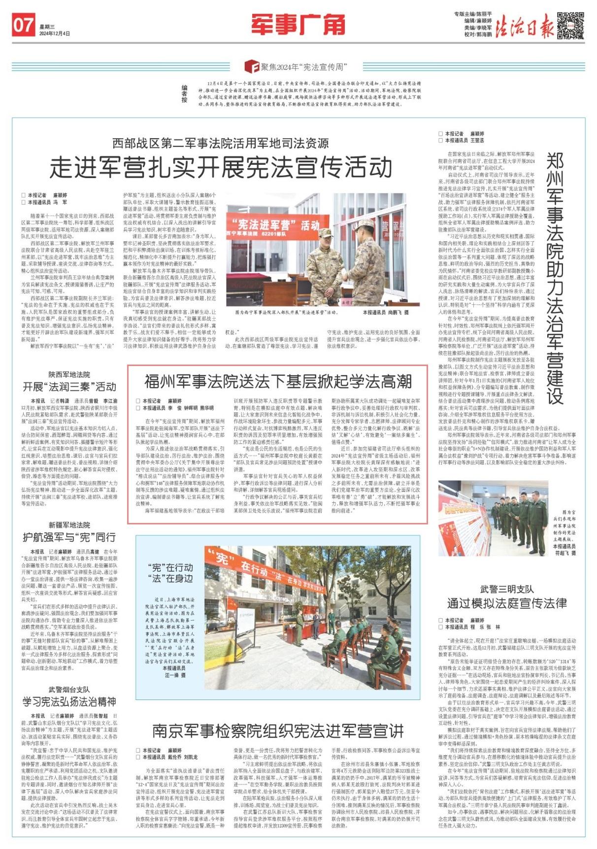 為深入推進(jìn)依法治軍戰(zhàn)略貫徹落實,引導(dǎo)部隊建設(shè)法治、厲行法治、維護(hù)法治,圍繞貫徹中央軍委辦公廳《關(guān)于集中開展尊法學(xué)法守法用法活動的通知》,福州軍事法院針對“榕戍說法”“法治輔導(dǎo)員”、綜合法律服務(wù)中心和擁軍“148”法律服務(wù)保障軍地聯(lián)動協(xié)作機(jī)制等反饋的涉法難題、疑難案情,通過組織法治宣講、編制普法書籍等,讓官兵系統(tǒng)了解憲法精神。
