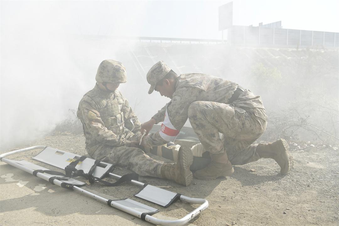 戰(zhàn)場情況瞬息變化,情況一個接著一個?!皥蟾嬷笓]員,我分隊遭敵襲擊,有2人受傷嚴重,無法繼續(xù)參加‘戰(zhàn)斗’?!薄把杆俳M織傷員救護轉移。”由地方醫(yī)療專業(yè)力量組成的醫(yī)療救護分隊迅速反應,穿過濃煙趕赴“戰(zhàn)場”,現場對“傷員”進行止血、包扎處理后,用擔架轉移至救護車內組織后送。