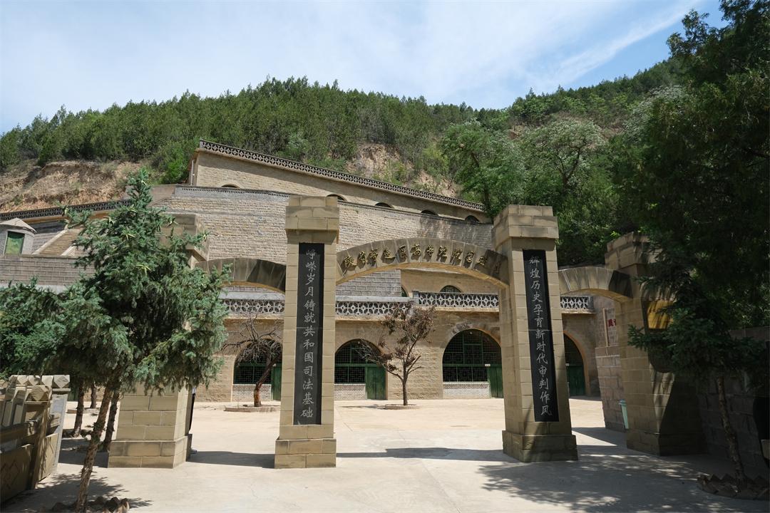 拾級而上,山頂一座莊嚴(yán)肅穆的三孔石拱門映入眼簾,“陜甘寧邊區(qū)高等法院舊址”11個鎦金大字在石拱門正中,兩側(cè)題寫“崢嶸歲月鑄就共和國司法基礎(chǔ) 輝煌歷史孕育新時代審判作風(fēng)”。