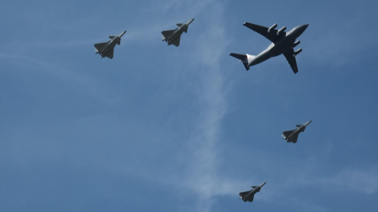 圖為運-20專機“過水門”時,與通場飛行的殲-20編隊同框。