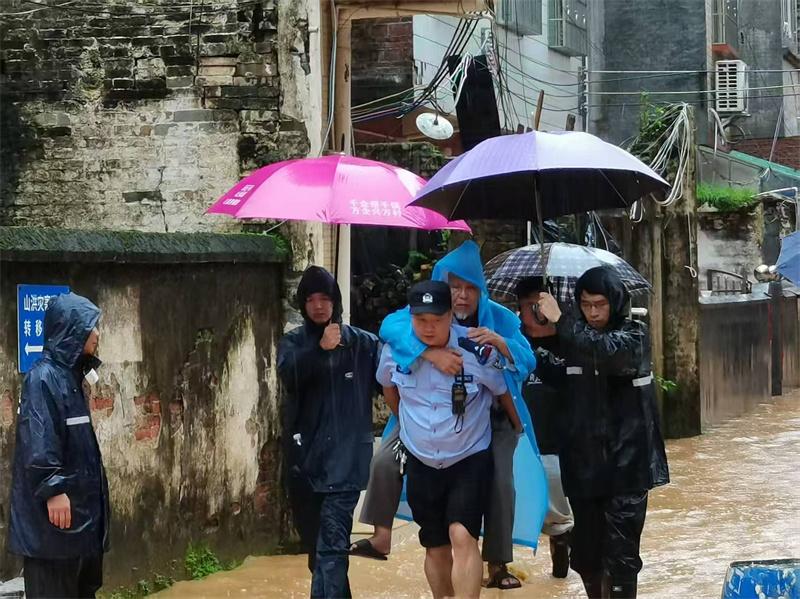 6月16日下午,懷集縣公安局鳳崗派出所與鎮(zhèn)政府工作人員在鳳崗舊圩冒雨轉(zhuǎn)移受災(zāi)群眾。李明烘 攝