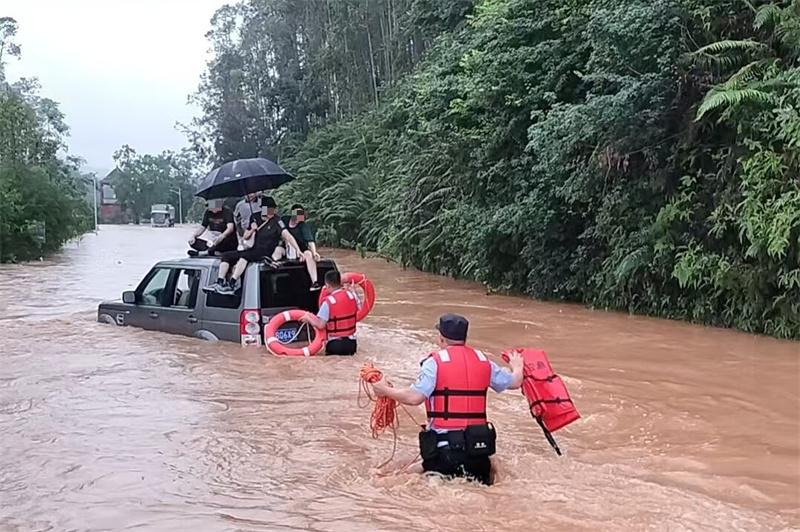 6月17日下午,懷集公安接到群眾緊急求助,稱中洲鎮(zhèn)泰西村路段有5人被困在兩輛車的車頂。轄區(qū)派出所民警接報(bào)后迅速驅(qū)車趕赴現(xiàn)場,蹚過齊腰深的洪水靠近被困車輛,成功將5名被困人員全部救出。