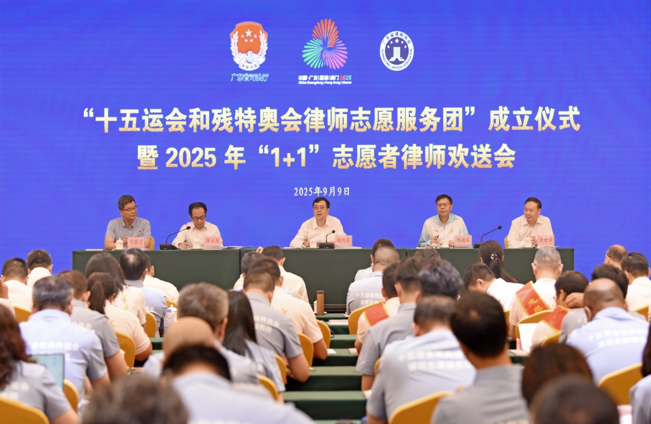 為全力保障“十五運會和殘?zhí)貖W會”順利舉辦,廣東省律師協(xié)會積極響應省委、省政府“當好東道主”的號召,于9月9日在廣州正式成立“十五運會和殘?zhí)貖W會律師志愿服務團”,并舉行2025年“1+1”志愿者律師歡送會。廣東省司法廳黨委書記、廳長陳旭東出席儀式并講話,省司法廳黨委委員、副廳長陳永康主持活動。