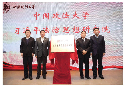 圖為張文顯(右二)、徐顯明(左二)、胡明(右一)、馬懷德(左一)一同為中國政法大學(xué)習(xí)近平法治思想研究院揭牌 尹建峰 攝