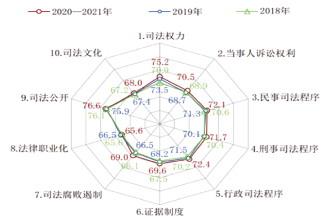 2.2020-2021年值得注意的數(shù)據(jù):一是上海市以73.3分排在中國司法文明指數(shù)得分第一名,這是其在七年評估中第五次排名第一,比2019年第一名浙江的72.5分高出0.8分;內(nèi)蒙古自治區(qū)以69.2分在各省/自治區(qū)/直轄市中排名墊底,但比2019年最低分湖南67.1分提高了2.1分;二是31個省/自治區(qū)/直轄市最高分與最低分的分差為4.1分,相較于2019年最大分差5.4分,縮小了1.3分,這說明全國各地司法文明的差距進(jìn)一步縮小;三是31個省/自治區(qū)/直轄市的得分均未達(dá)到“良好”水平,說明各地司法文明建設(shè)還有很大的努力空間。