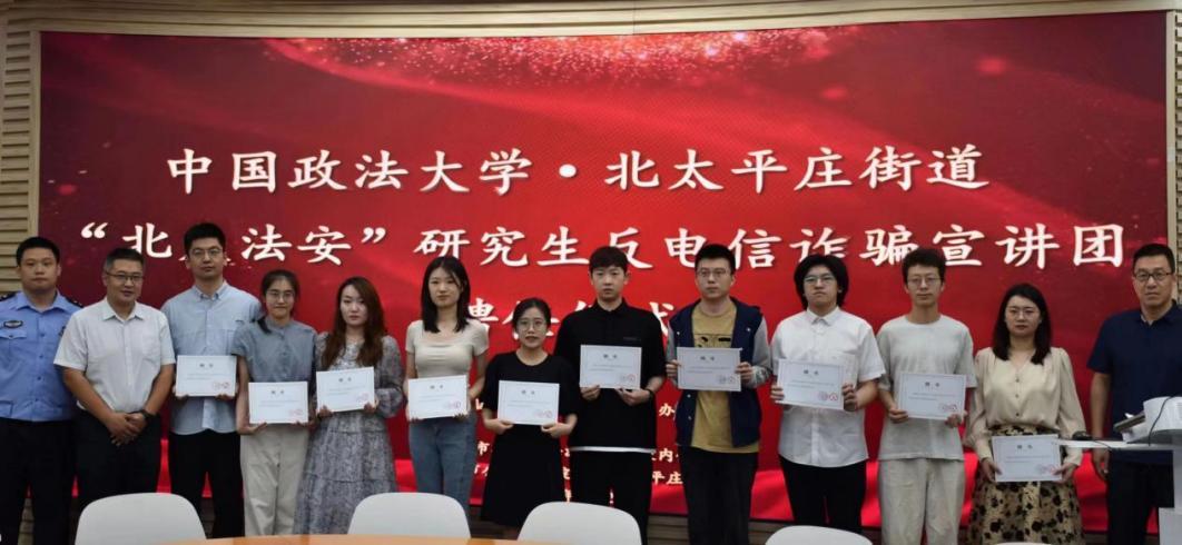 為進(jìn)一步加強(qiáng)與完善研究生社會(huì)實(shí)踐育人體系,引導(dǎo)和鼓勵(lì)中國(guó)政法大學(xué)研究生發(fā)揮專業(yè)優(yōu)勢(shì),深入基層實(shí)踐,服務(wù)基層法治建設(shè),今年3月,中國(guó)政法大學(xué)研究生工作辦公室、刑事司法學(xué)院聯(lián)合北京市公安局海淀分局北太平莊派出所共同組建“北太法安”中國(guó)政法大學(xué)研究生反電信詐騙宣講團(tuán)。6月28日,"北太法安"研究生反電信詐騙宣講團(tuán)聘任儀式在中國(guó)政法大學(xué)學(xué)院路校區(qū)舉行。