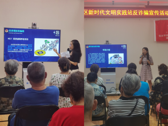 宣講團(tuán)成員王舒琦、李成秀在北京市海淀區(qū)北太平莊街道明光北里社區(qū)的社區(qū)活動(dòng)中為老年人們進(jìn)行了防范養(yǎng)老詐騙宣傳。兩位同學(xué)結(jié)合類(lèi)型分析與實(shí)務(wù)案例,重點(diǎn)介紹了誘導(dǎo)消費(fèi)類(lèi)、投資理財(cái)類(lèi)、養(yǎng)老保險(xiǎn)類(lèi)等典型騙局的詐騙方式,分享了針對(duì)性的防范路徑與預(yù)防措施,并給出了具體的防范建議。兩位同學(xué)的講解幫助老年人充分認(rèn)識(shí)到防范詐騙的重要性,樹(shù)立了反詐意識(shí),了解了防詐知識(shí)。