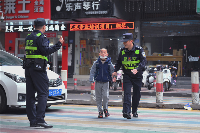 “同學(xué)們,請(qǐng)排隊(duì)有序通過,不要相互推擠?!痹谄翁锸袑?shí)驗(yàn)小學(xué)門口,身穿紅馬甲的家長志愿者,戴紅袖標(biāo)的學(xué)校工作人員,警容嚴(yán)整的執(zhí)勤民警各司其職,他們?cè)谛iT口積極開展交通引導(dǎo)、護(hù)送學(xué)生安全通過斑馬線、勸導(dǎo)違停車輛忙碌的身影,總是讓家長和孩子們倍感溫暖和安心。