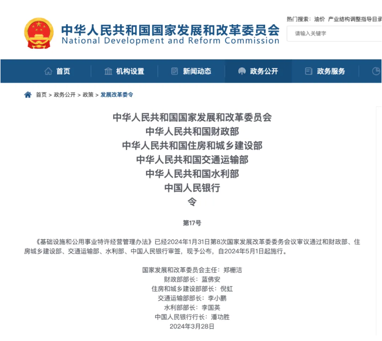 《基礎(chǔ)設(shè)施和公用事業(yè)特許經(jīng)營(yíng)管理辦法》(以下簡(jiǎn)稱(chēng)“《辦法》”)已經(jīng)2024年1月31日第8次國(guó)家發(fā)展改革委委務(wù)會(huì)議審議通過(guò)和財(cái)政部、住房城鄉(xiāng)建設(shè)部、交通運(yùn)輸部、水利部、中國(guó)人民銀行審簽,自2024年5月1日起施行。原《基礎(chǔ)設(shè)施和公用事業(yè)特許經(jīng)營(yíng)管理辦法》(國(guó)家發(fā)展改革委等6部委2015年第25號(hào)令)同時(shí)廢止。