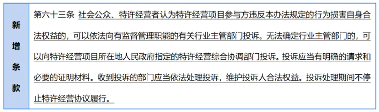 《辦法》于第六十三條中補(bǔ)充了特許經(jīng)營(yíng)項(xiàng)目相關(guān)的投訴處理制度,為社會(huì)公眾、特許經(jīng)營(yíng)者利益的維護(hù)提供了法定的新途徑,進(jìn)一步保障了社會(huì)公眾及特許經(jīng)營(yíng)者的利益。明確可依法向有監(jiān)督管理職能的有關(guān)行業(yè)主管部門(mén)投訴,無(wú)法確定行業(yè)主管部門(mén)的,可以向特許經(jīng)營(yíng)項(xiàng)目所在地人民政府指定的特許經(jīng)營(yíng)綜合協(xié)調(diào)部門(mén)投訴。投訴應(yīng)當(dāng)有明確的請(qǐng)求和必要的證明材料。收到投訴的部門(mén)應(yīng)當(dāng)依法處理投訴,維護(hù)投訴人合法權(quán)益。