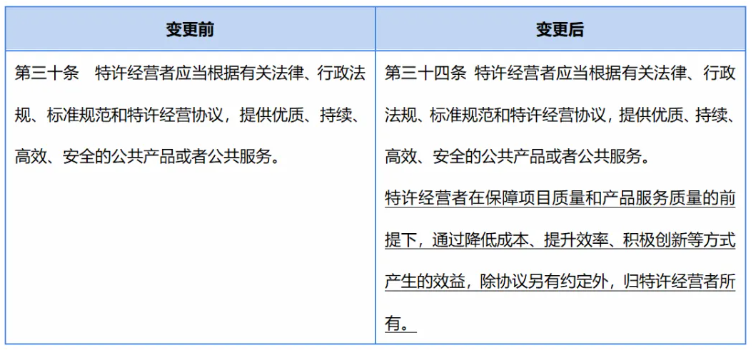 鼓勵(lì)提升效率,創(chuàng)新方式產(chǎn)生額外效益歸屬特許經(jīng)營(yíng)企業(yè)?!掇k法》第三十四條明確特許經(jīng)營(yíng)者在保障項(xiàng)目質(zhì)量和產(chǎn)品服務(wù)質(zhì)量的前提下,通過(guò)降低成本、提升效率、積極創(chuàng)新等方式產(chǎn)生的效益,除協(xié)議另有約定外,歸特許經(jīng)營(yíng)者所有。該條的補(bǔ)充,一定程度上激發(fā)了特許經(jīng)營(yíng)者的積極性,既能激發(fā)特許經(jīng)營(yíng)項(xiàng)目的創(chuàng)新,又增加了特許經(jīng)營(yíng)者的收益來(lái)源,有利于特許經(jīng)營(yíng)項(xiàng)目建設(shè)的良性發(fā)展。