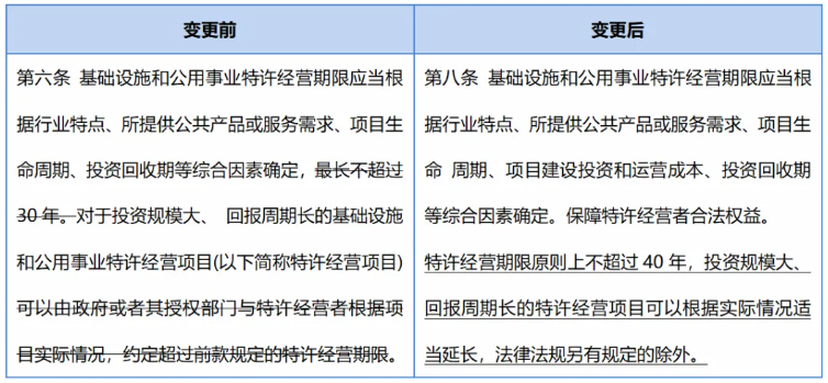原規(guī)定特許經(jīng)營(yíng)期限最長(zhǎng)不超過(guò)30年,為保障特許經(jīng)營(yíng)者合法權(quán)益,《辦法》中第八條明確特許經(jīng)營(yíng)期限原則上不超過(guò)40年,投資規(guī)模大、回報(bào)周期長(zhǎng)的特許經(jīng)營(yíng)項(xiàng)目可以根據(jù)實(shí)際情況適當(dāng)延長(zhǎng),法律法規(guī)另有規(guī)定的除外。