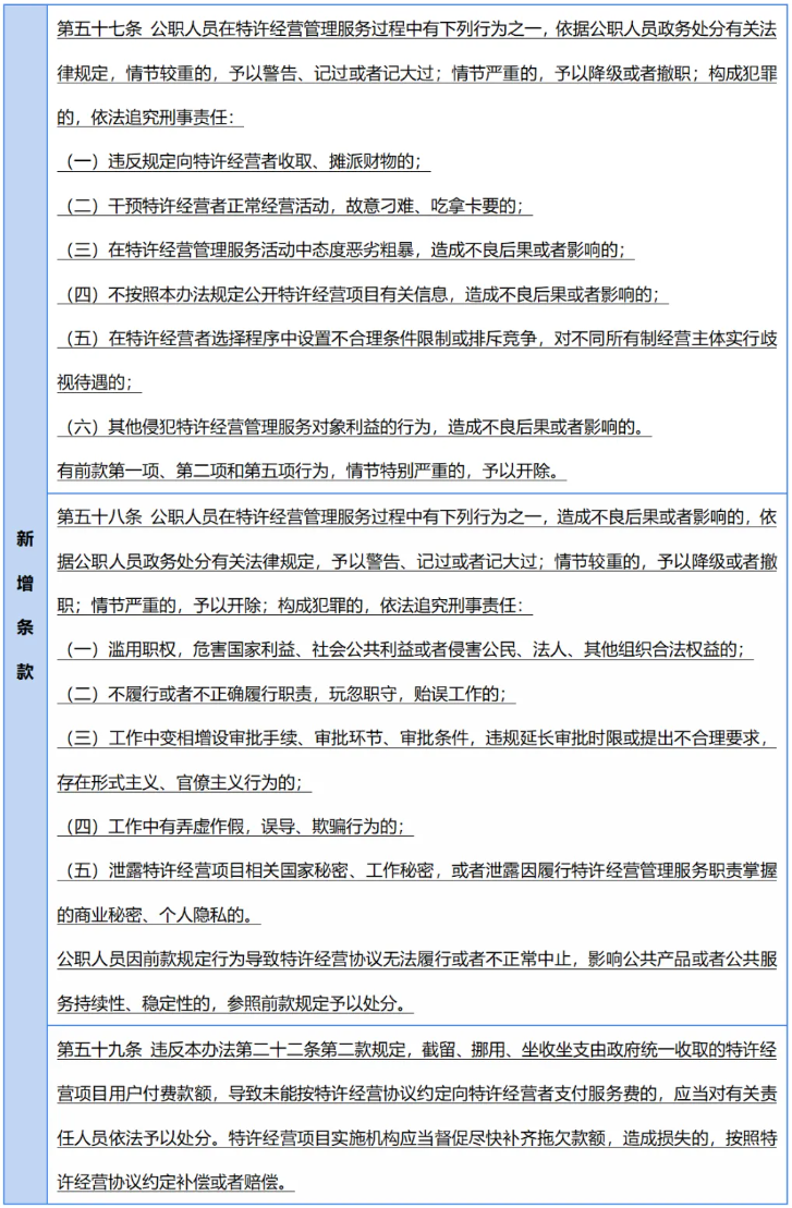 明確公職人員在特許經(jīng)營(yíng)管理服務(wù)中的違法行為及責(zé)任承擔(dān)?!掇k法》第五十七條、第五十八條明確在公職人員在存在規(guī)定行為的,依據(jù)公職人員政務(wù)處分有關(guān)法律規(guī)定,情節(jié)較重的,予以警告、記過(guò)或者記大過(guò);情節(jié)嚴(yán)重的,予以降級(jí)或者撤職;構(gòu)成犯罪的,依法追究刑事責(zé)任。