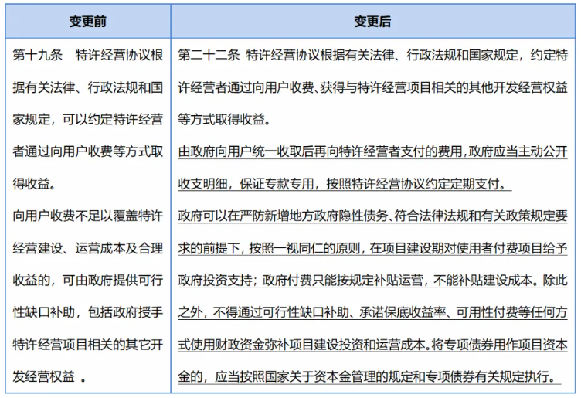 政府主動(dòng)公開(kāi)收支明細(xì),以補(bǔ)貼運(yùn)營(yíng)方式給予投資支持。雖《辦法》中仍明確由政府向用戶(hù)收取后再向特許經(jīng)營(yíng)者支付費(fèi)用,本次修訂中明確“政府應(yīng)主動(dòng)公開(kāi)收支明細(xì),保證專(zhuān)款專(zhuān)用,按照特許經(jīng)營(yíng)協(xié)議約定定期支付”,完善支付管理制度,一定程度上加大了信息公開(kāi)程度,確保收支公開(kāi)透明,有利于維護(hù)投資企業(yè)的利益。同時(shí),一定條件下政府可按規(guī)定補(bǔ)貼運(yùn)營(yíng),肯定了用專(zhuān)項(xiàng)債券用作項(xiàng)目資本金的方式。