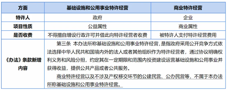 ③范圍上,基礎(chǔ)設(shè)施和公用事業(yè)特許經(jīng)營(yíng)范圍,不包括商業(yè)特許經(jīng)營(yíng)以及不涉及產(chǎn)權(quán)移交環(huán)節(jié)的公建民營(yíng)、公辦民營(yíng)等。